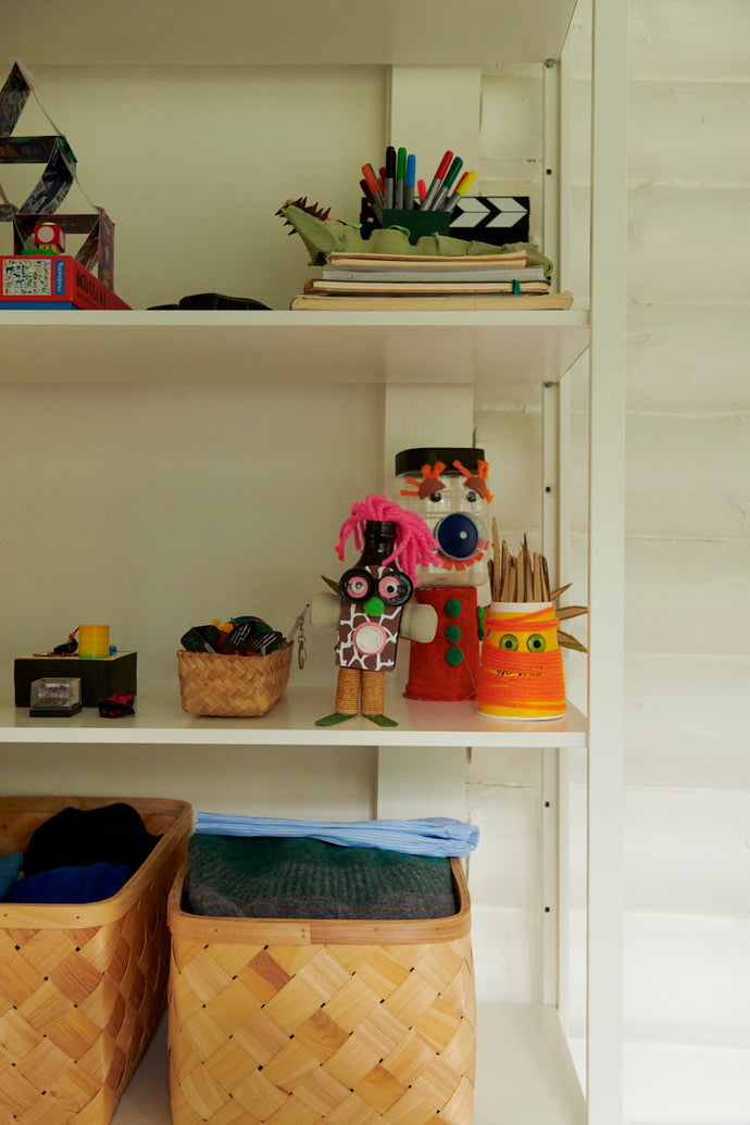 Gilbert's clothes are also stored here in baskets, to create a sense of order. Seen here is the Avala Sweater from Caramel and our own Cotton Pants, made from deadstock fabric sourced in Italy.