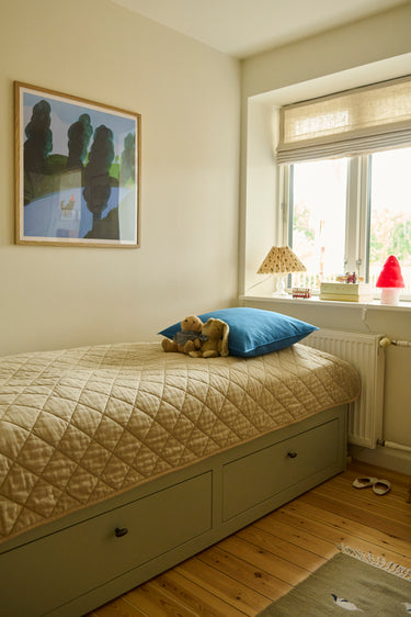 Vincent & Rose's shared bed, made up for day, with a large blue pillow. Above, the poster 'Pimme & Nissen på Eventyr'