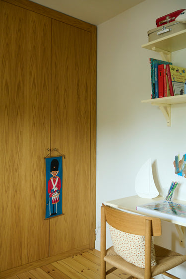 Shelvings above the table keep toys, books, and everyday items organized and easily accessible when needed. Two open raffia baskets are used for storage – see other colours here. A spaceship lamp is placed on the table; alongside creative projects and a game of backgammon.