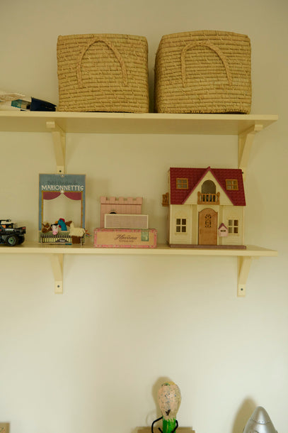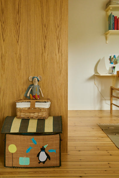 A raffia basket from a previous collection is used to store toys. Explore our selection of raffia baskets here.