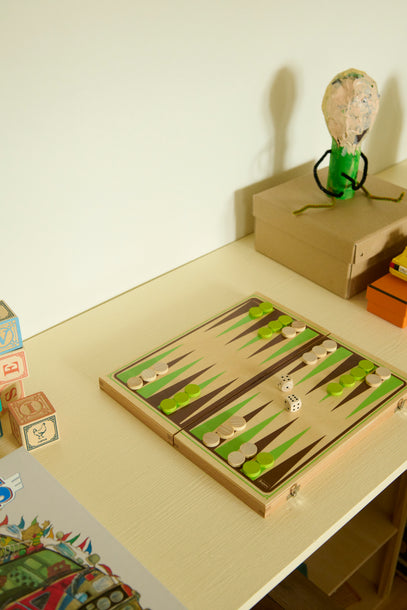 Backgammon, a few boxes for storage, old wooden cubes – and a green man made from a toilet paper roll – all have a place on the table.