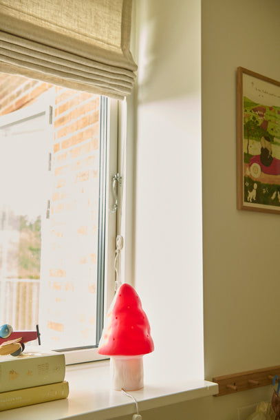 A red mushroom lamp sits in the window sill and adds a warm and lovely light when it is turned on at night. Next to it lie a few books, including H. C. Andersen's Fairytales.