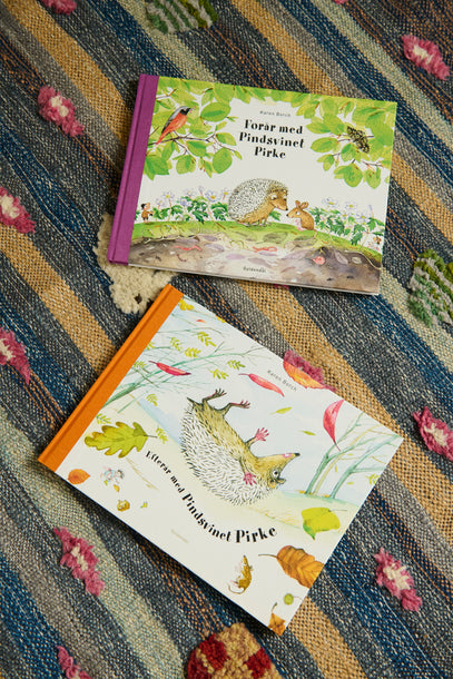 Current reads with 'Pindsvinet Pirke' from Gyldendal lie on the colourful rug from Mini Knots. Find a similar one here.