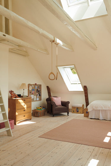 The nook has been transformed into a desk area, and Varla spends hours here being creative. Two Klapp chairs in oak are placed here – one for Varla, and one for a parent or a friend.