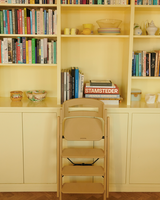 The high chair is foldable, and only takes up 13 cm of space in width when not in use.