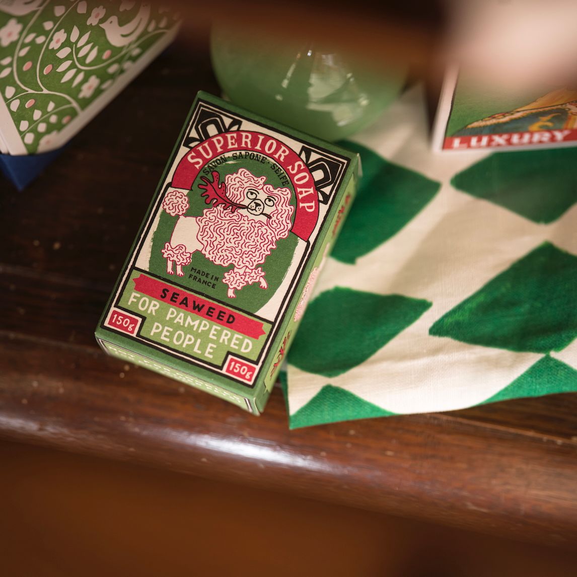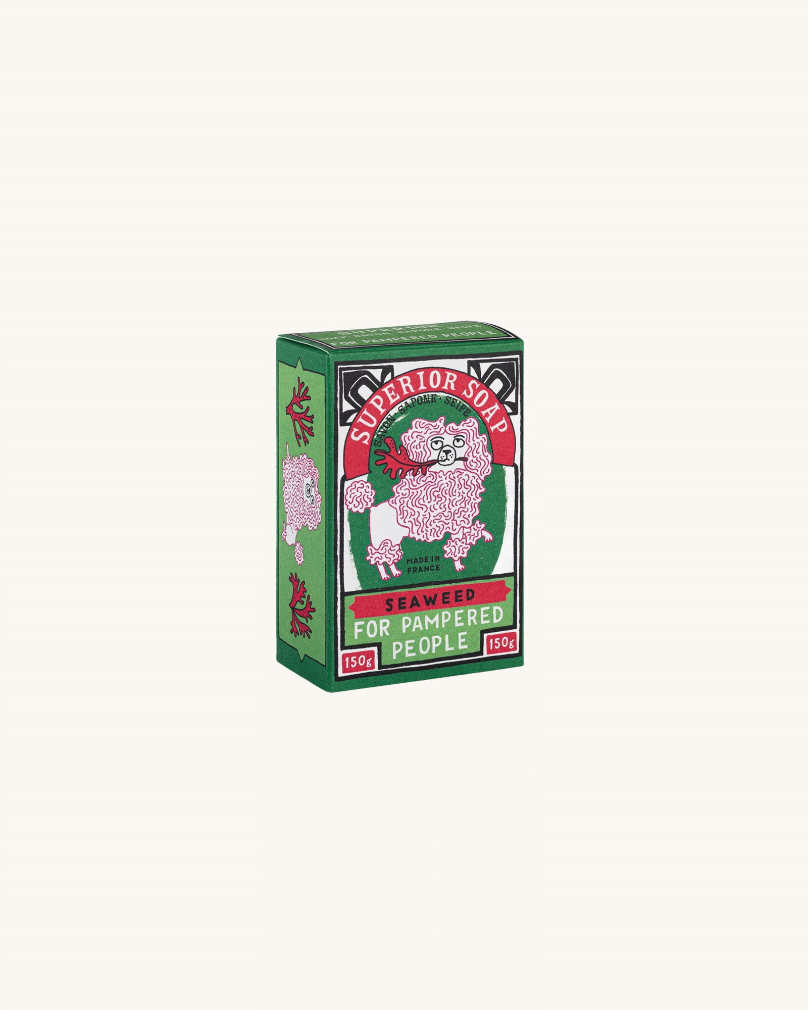 The Savon d'Archivist seaweed scented green soap embossed with a poodle comes in a bold green and red decorative packaging that features a grumpy poodle.