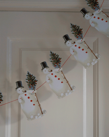 A beautiful and cosy garland featuring ten repeated motifs of a snowman with a Christmas tree.