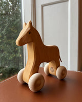 Willy is a beautiful, handcrafted wooden horse on wheels.