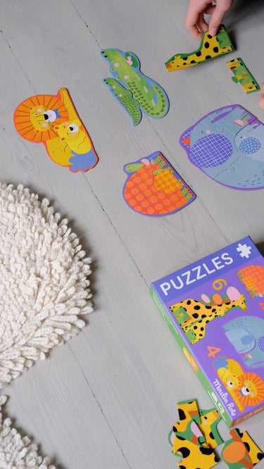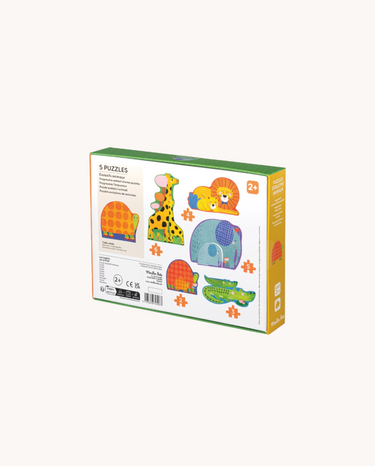 A set of five puzzles with 2 to 6 pieces – perfect for little hands learning to count.