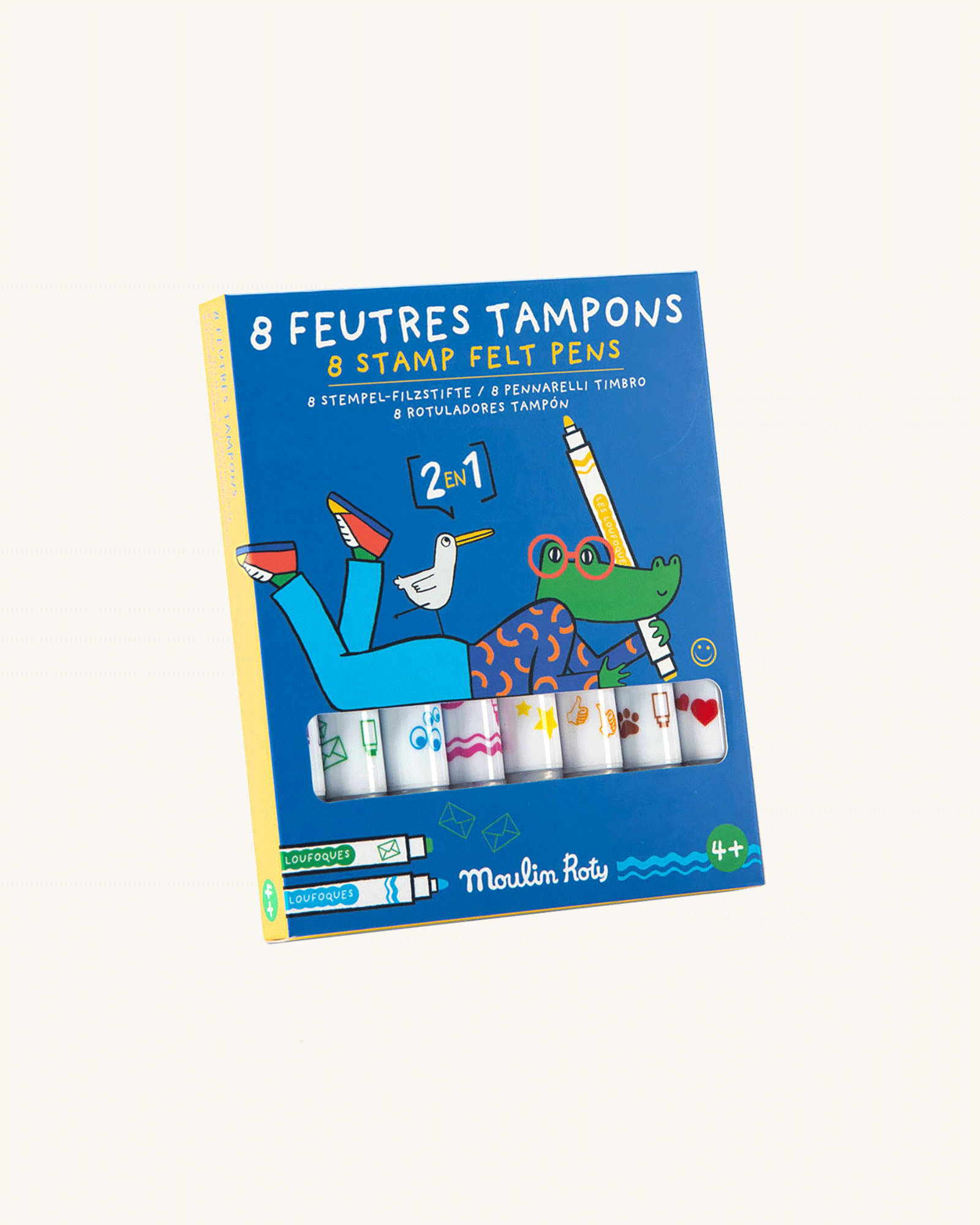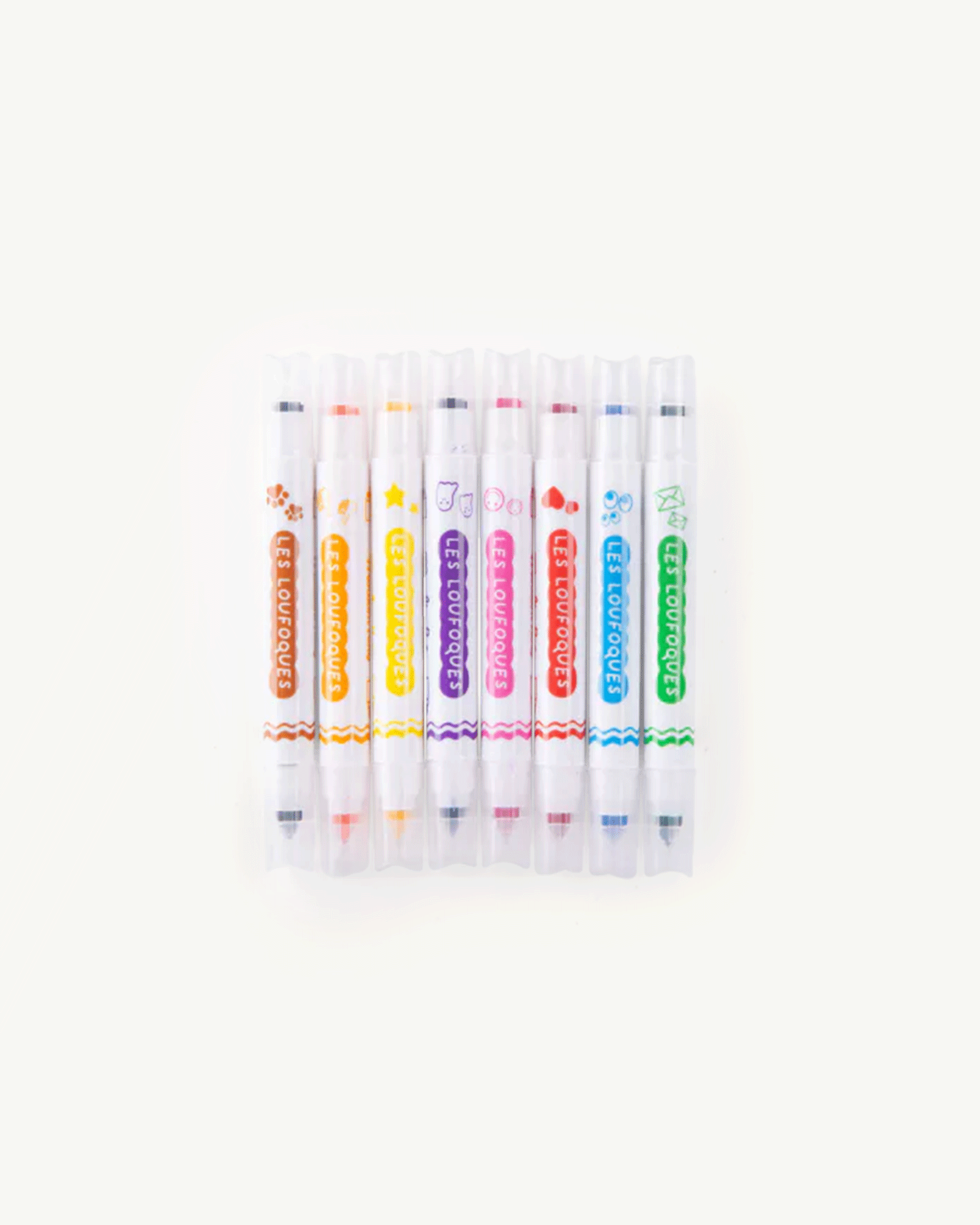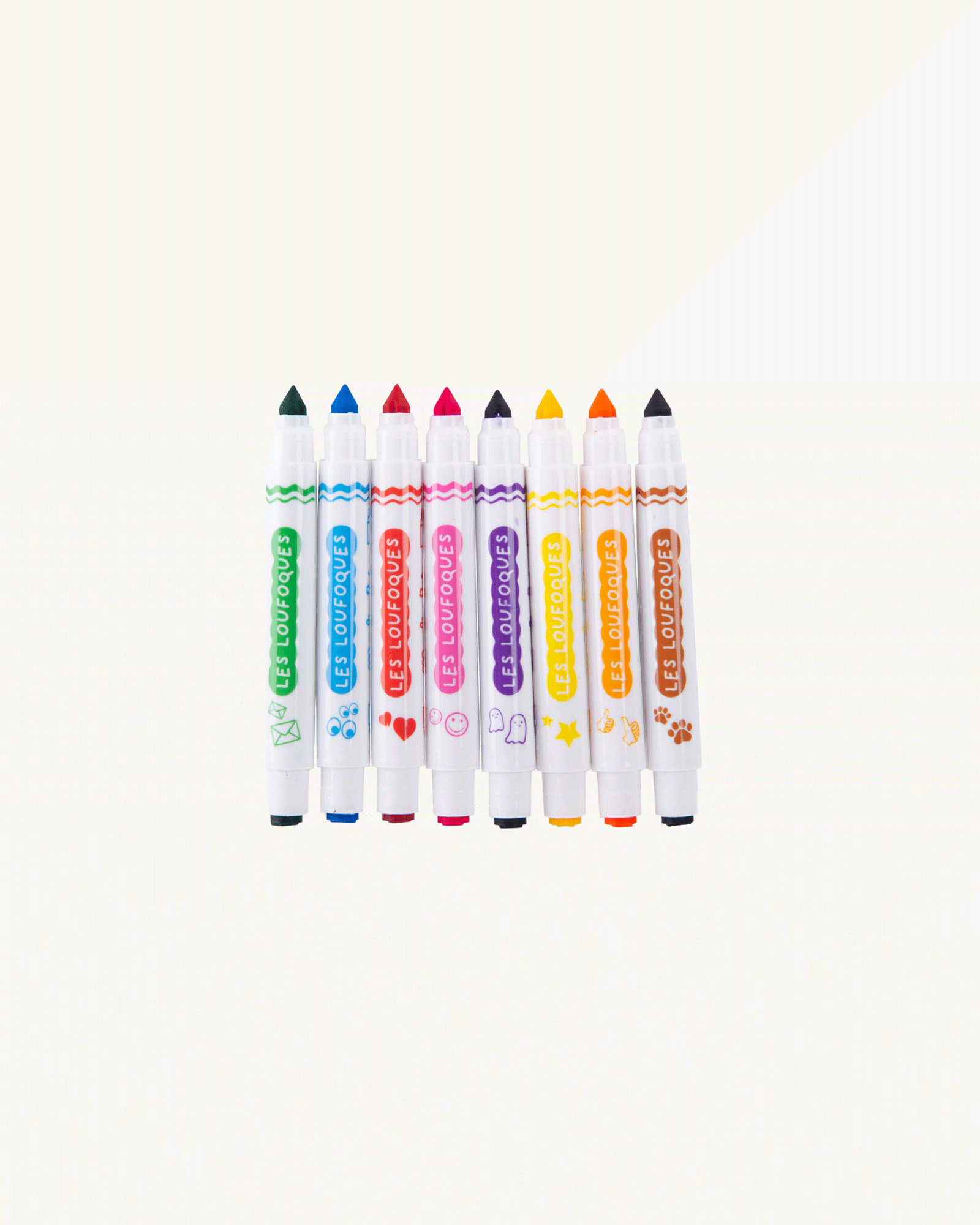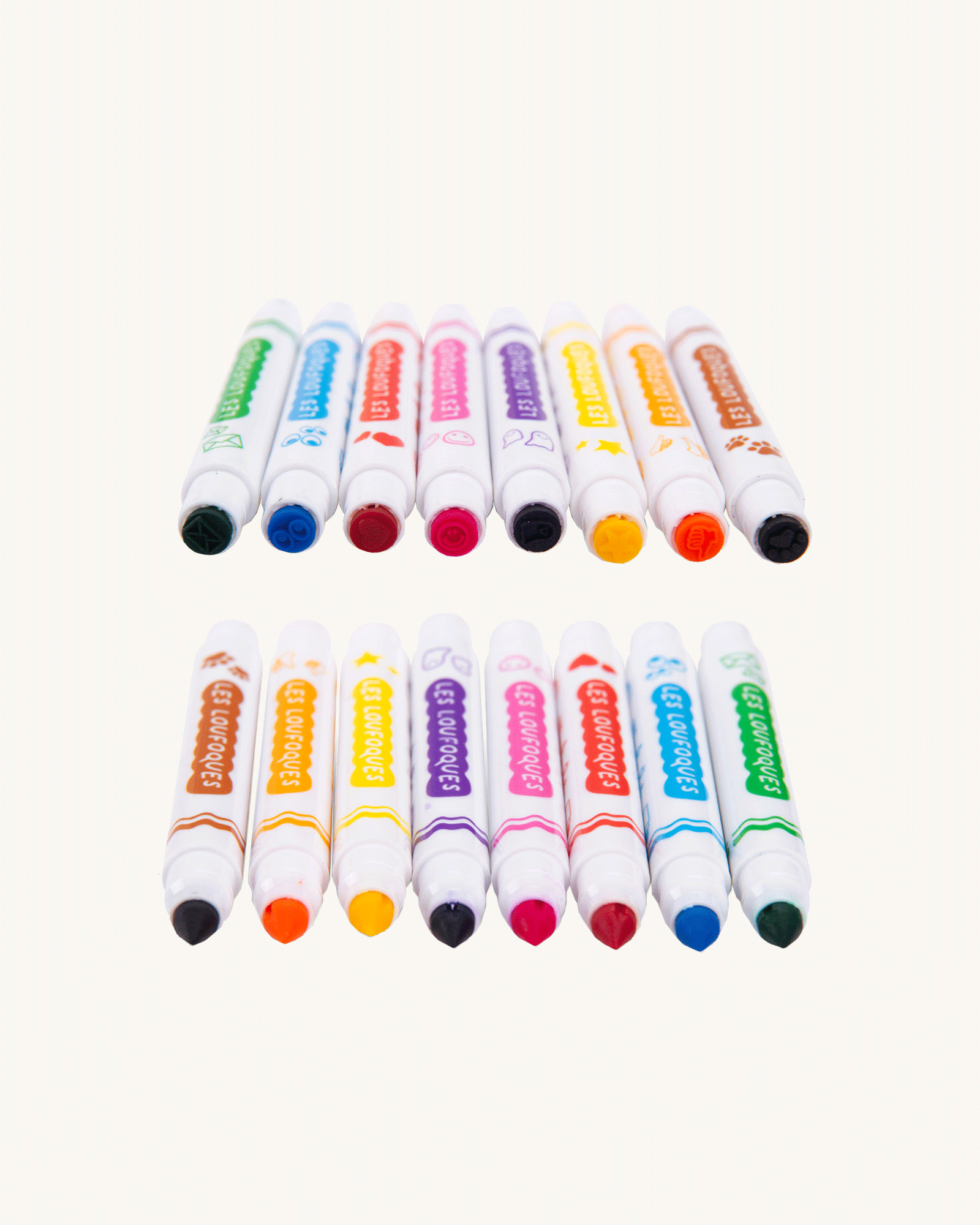 8 large felt-tip pens with two functions: a double-thickness tip on one side and a stamp on the other. They are perfect for bringing the most beautiful creations to life and decorating them with pretty patterns. These pens are washable.