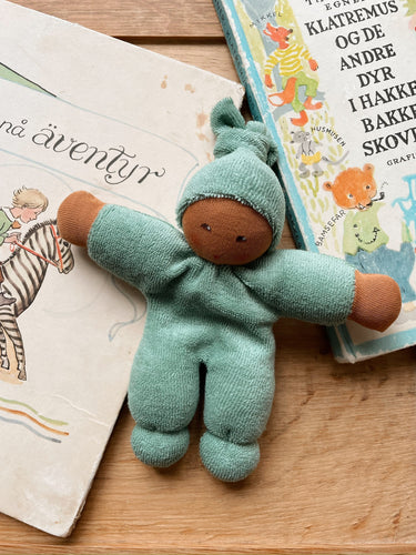 A lovely and incredibly soft little Pimpel Doll from Nanchen in a soft, sage green colour.