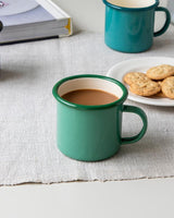 A large enamel cup with a handle. Perfect for hot chocolate in the forest or hot tea in the garden at home.