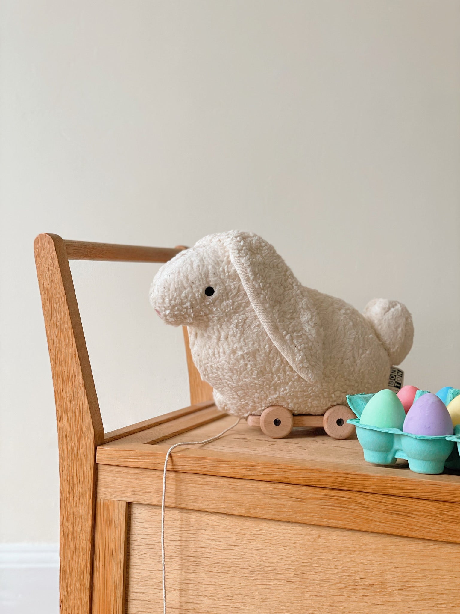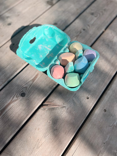 The Chalk Eggs come in a box with 6 chalks in colours: Pink, green, orange, blue, yellow and purple.