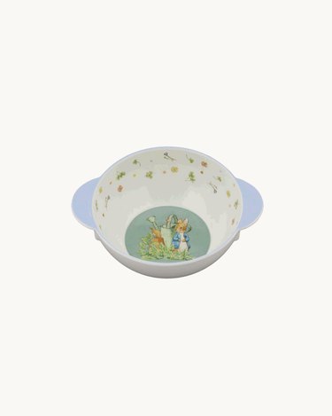 A practical melamine bowl that is beautifully decorated with illustrations of Peter Rabbit.