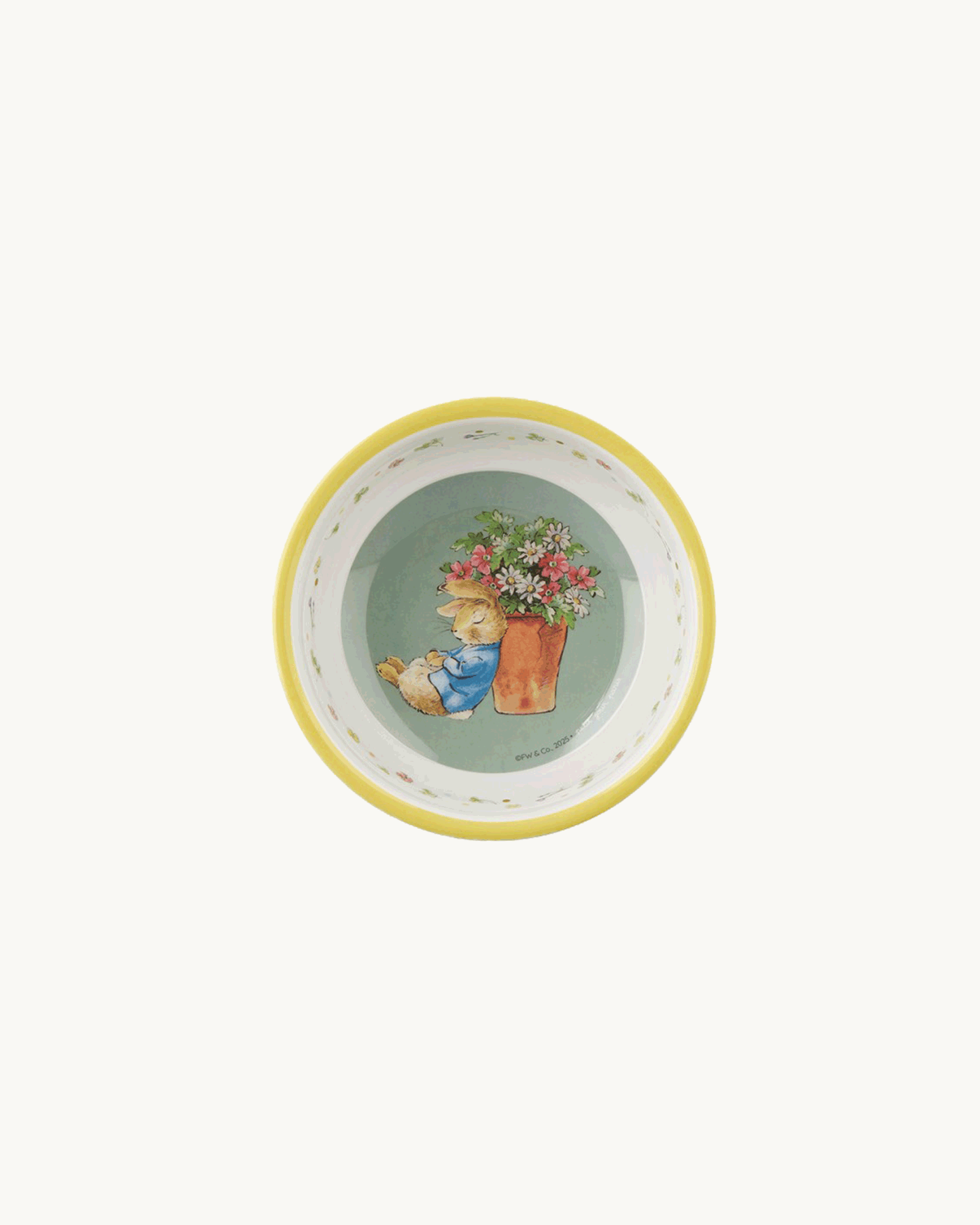 A practical melamine bowl that is beautifully decorated with illustrations of Peter Rabbit.