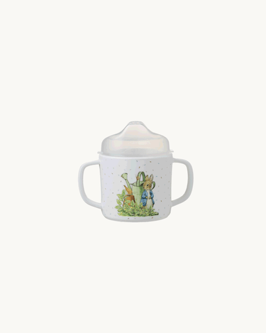 A cute Peter Rabbit baby sippy cup with a handle on either side, and a removable top.