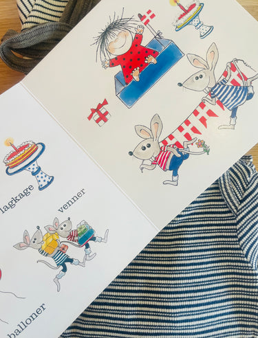 A cardboard book with thick pages and simple text for the youngest Cirkeline fans. Cirkeline and her good friends the mice Frederik and Ingolf love words.