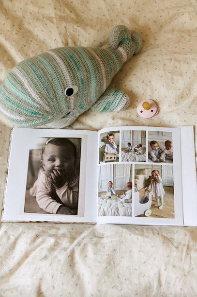 En skøn strikket hval og en sut i farven baby pink ligger på sengen ved siden af en bog fyldt med billeder og dejlige minder fra Once Upon.