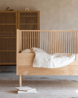 Tremmesengen er fremstillet af 100% solidt asketræ, som er en smuk træsort, der er slidstærk, solid og hvor årerne kan ses i træet. Den har et naturligt look, og passer smukt ind i minimalistiske babyværelser, men er også flot på farverige børneværelser, hvor træet fungerer som en rolig base.