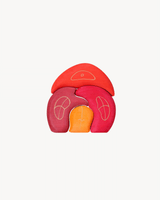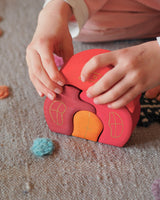 Farverige byggeklodser fra Grimm's danner et hyggeligt lille hus, men kan også bruges som et stablelegetøj eller som en del af et større byggeri