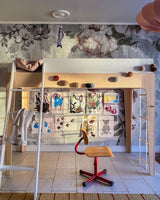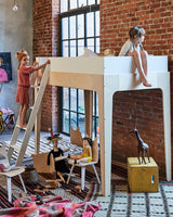Hems køjesengen er en super løsning til små værelser, hvor pladsen skal optimeres. Ved at løfte sengen op er der plads til et skrivebord, et legeområde, et læsehjørne mm nedenunder. Der er også plads til at stille en tremmeseng, juniorseng eller stor seng nedenunder hemsen, hvis I har 2 børn, der deler værelse.