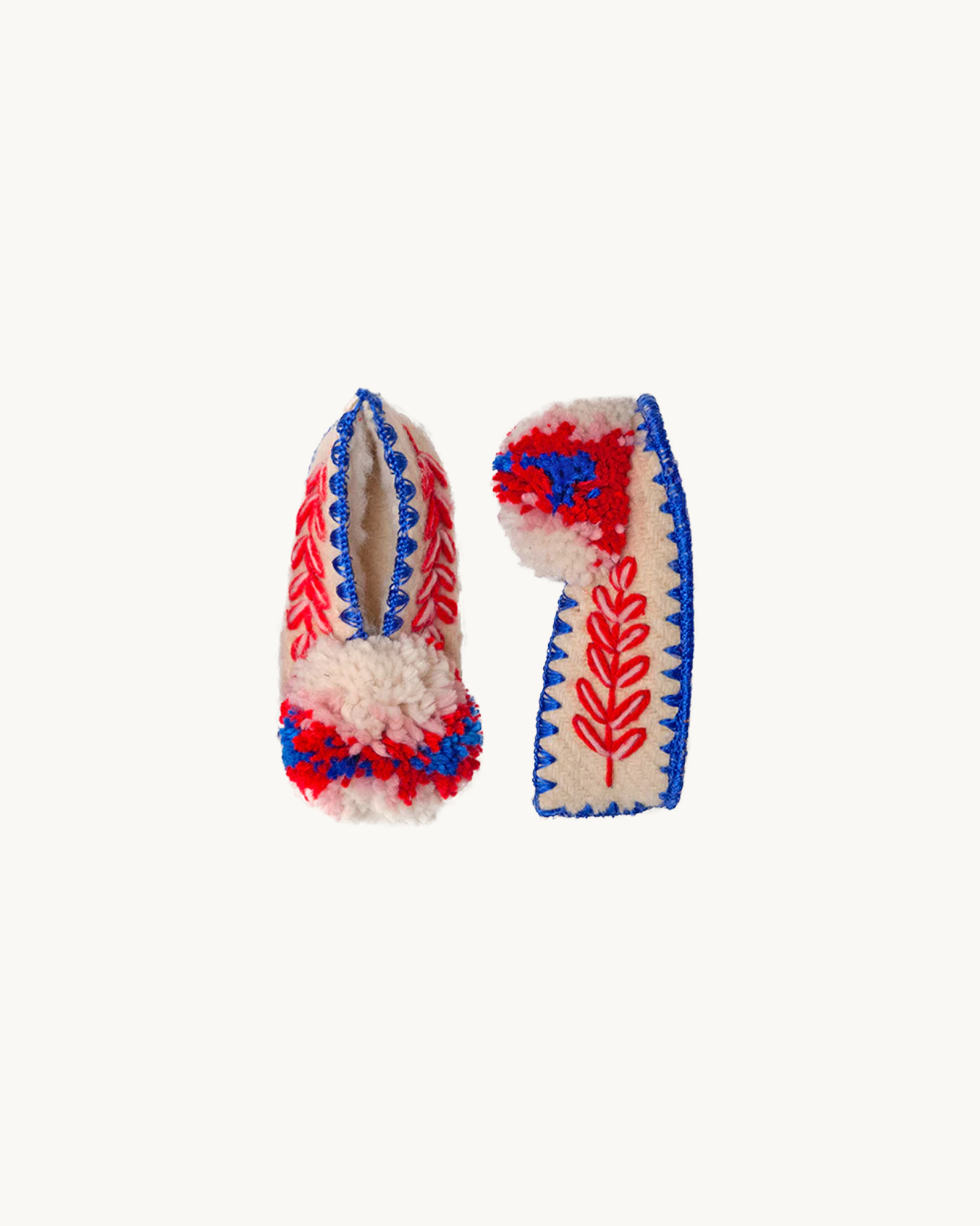 Fantastiske, fine, bløde og håndlavede hjemmesko – fremstillet i uld med lædersål. De kommer med de smukkeste detaljer og en stor, iøjenfaldende ponpon, som man ikke kan andet end at holde af.