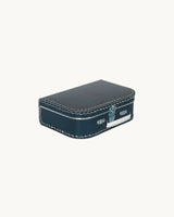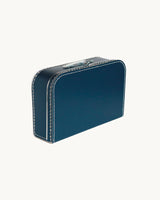 Kufferten er håndsyet med en cremefarvet snor, og kommer med flotte messing lukninger og hvidt håndtag. Derudover er der på laget en metalkant, der beskytter kassen, og gør den mere robust.