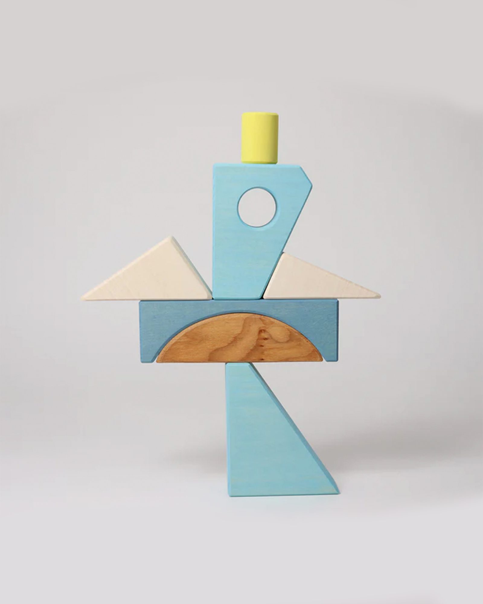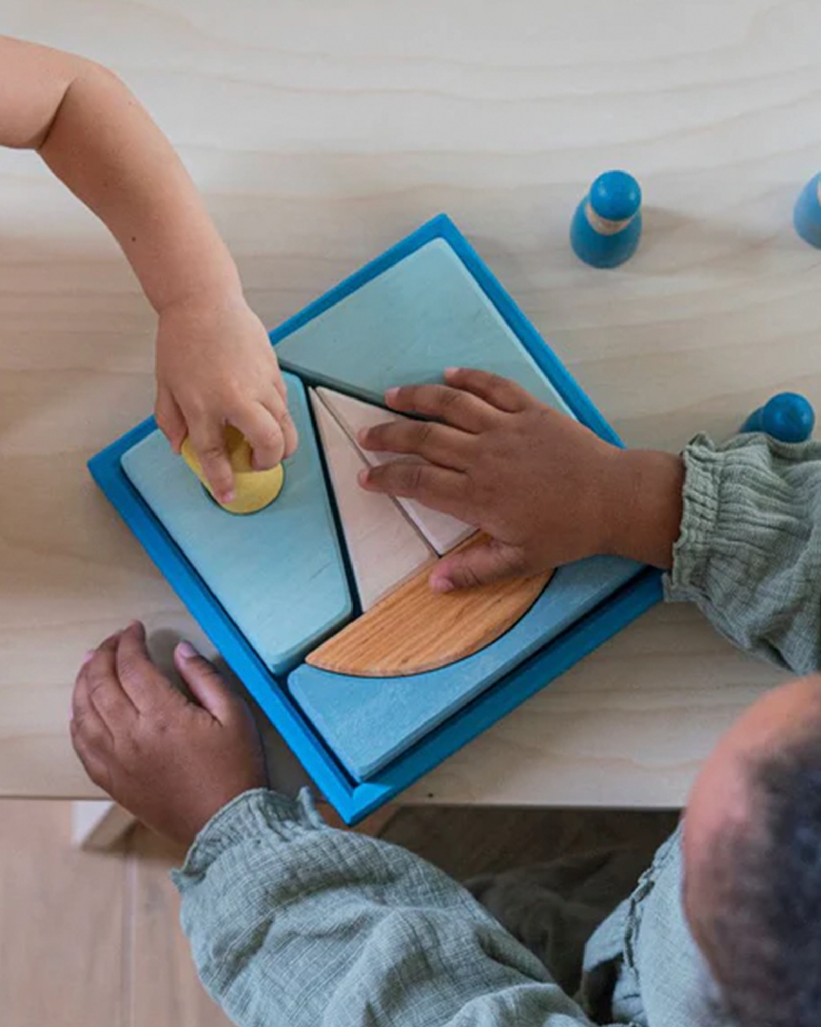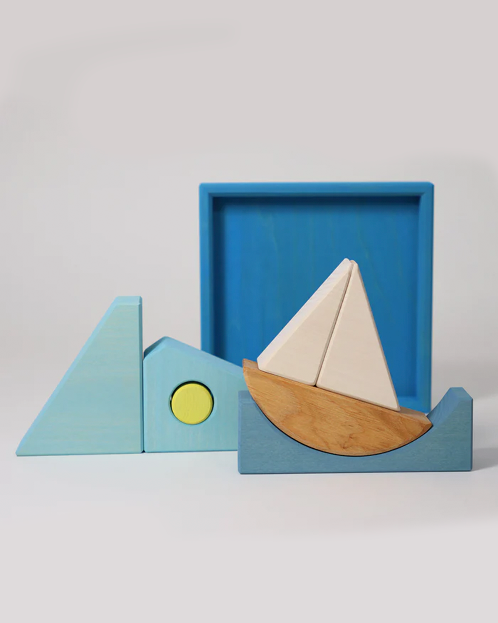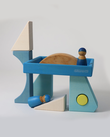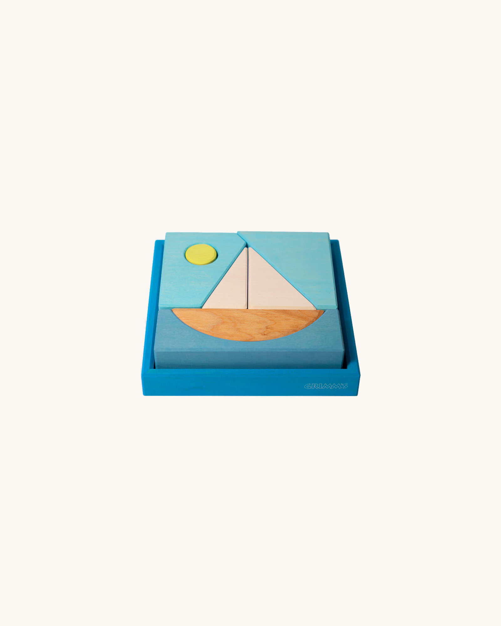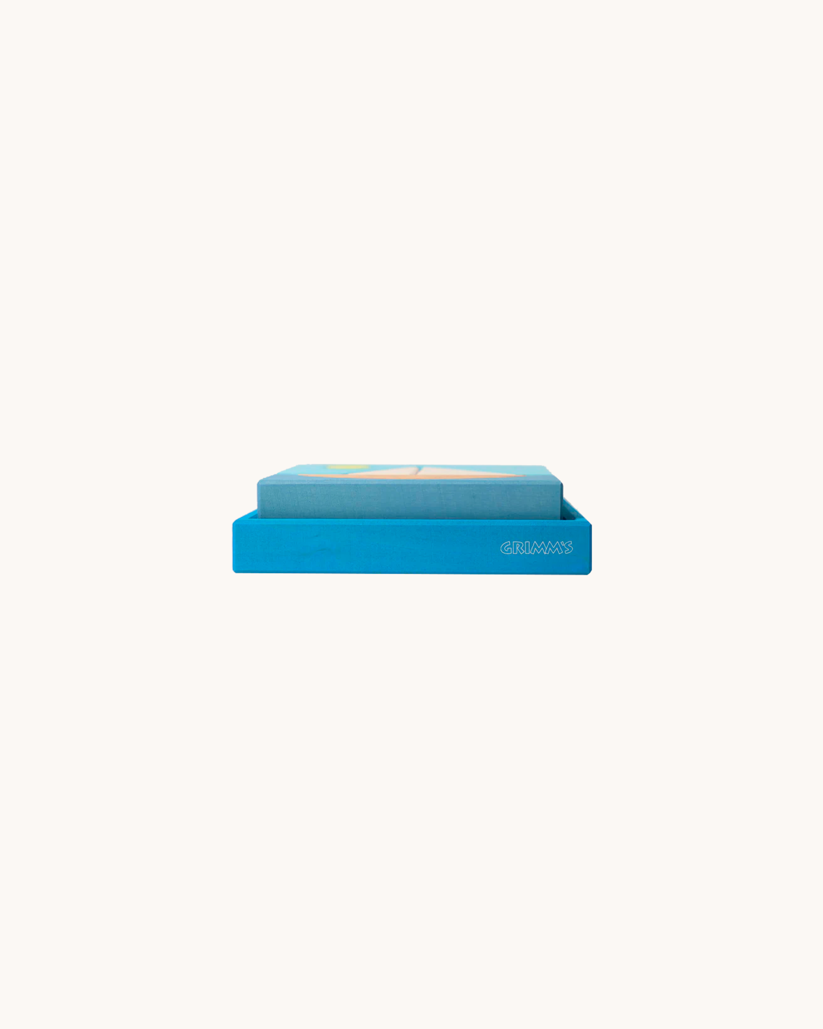 Et smukt byggesæt/puslespil i blå nuancer fra tyske Grimm's. Sættet kan bruges både som et puslespil og som et byggesæt, hvor kun fantasien sætter grænser.