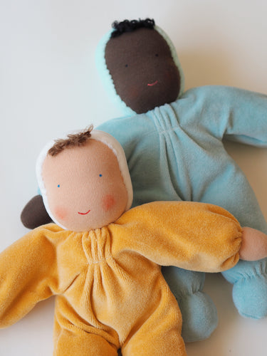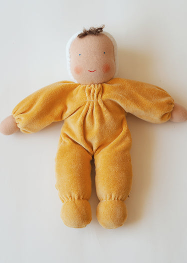The doll's face is hand painted in a traditional Waldorf way with few features enabling babies and children to use their imagination and let play and creativity run free.