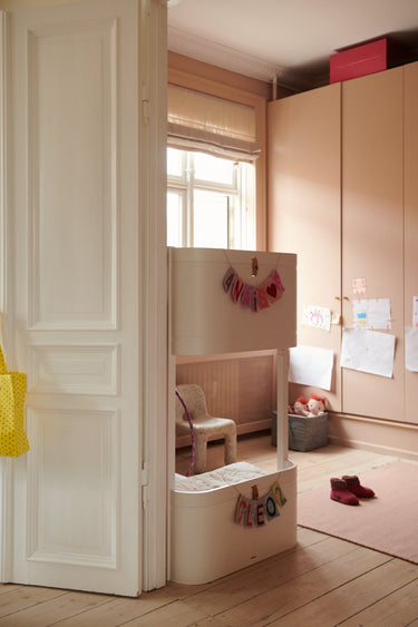 This low bunk bed is designed to accommodate the need to sleep two kids in a smaller children’s bedroom. 'Wood Mini' bunk bed is with the generous measurements but small stature well suited in rooms where classic bunk beds are too big.