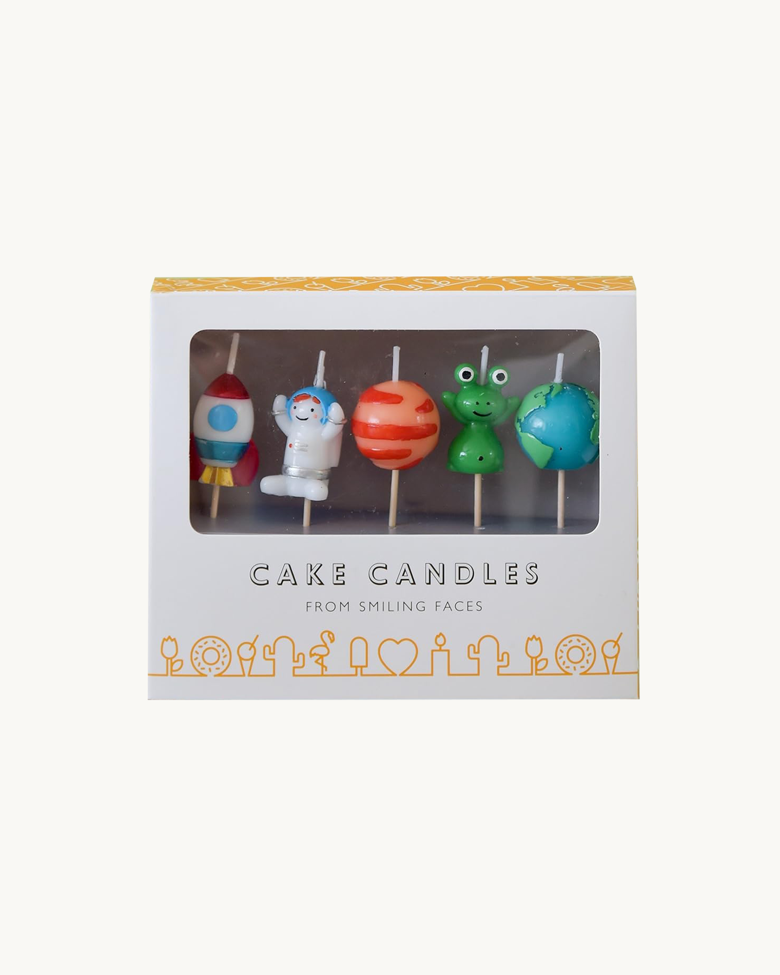 One set includes 5 candles, including a space ship, an astronaut, an alien and two planets.