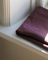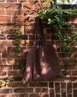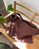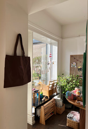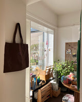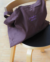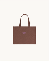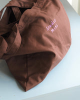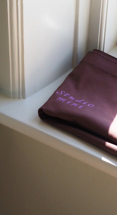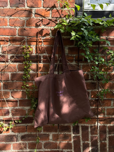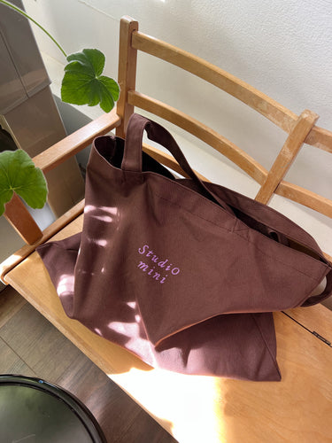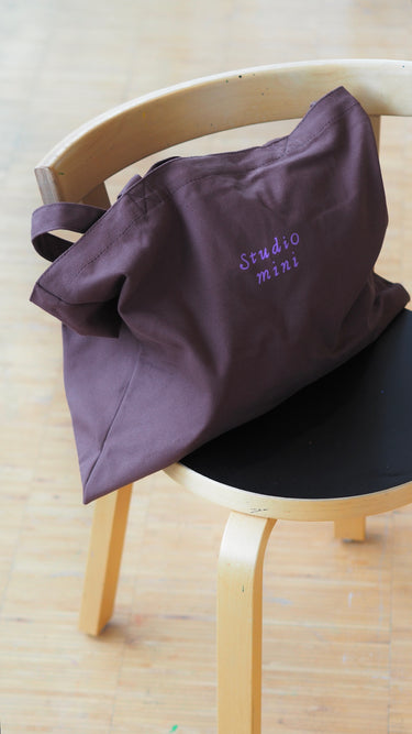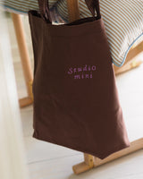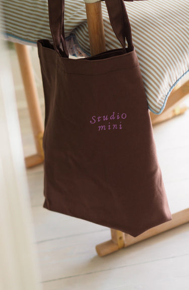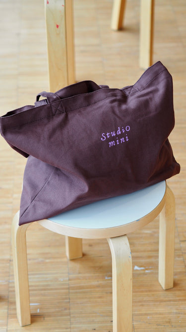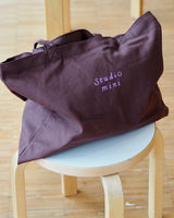 Our totes are available in 2 sizes and 2 colours. This large one comes in a deep brown color with the Studio Mini logo printed on in a lovely purple.