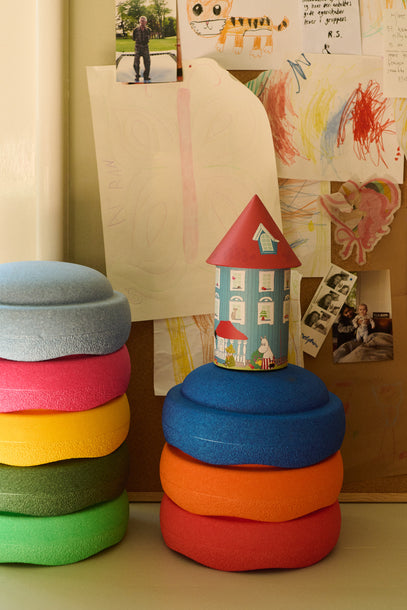 A pin board is placed on either end of the room – one for each of the boys. This is where they keep personal notes, invitations and pictures. Colourful Stapelsteins are placed on the floor, ready for play as well as a Moomin Memory Game, that comes in a box looking like the Moomin House.
