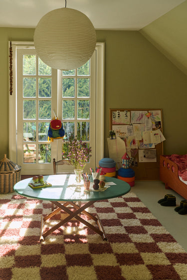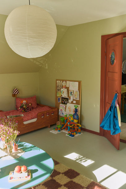 A low round table – a great vintage find painted in colour 'Vardo' from Farrow & Ball – sits in the middle of the room, allowing Alban and Noam to play and draw at a comfortable height.