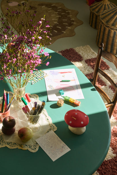 A mushroom piggy bank is placed on the low table. Also seen here: A large wooden dice and a stackable highlighter set. Other pens and markers are stored in beautiful Akua glasses designed by Annika, Alban and Noam's mom.