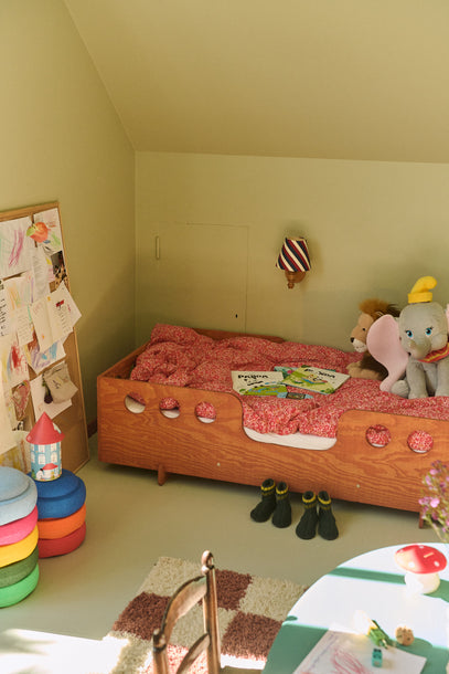 The layout is wonderfully simple: Both beds line one wall, freeing up the middle of the room for what matters most at this age: Play, focus and creativity. Books, toys and fun games fill the shelves, and are stored in baskets and on shelves so that they are easily within reach.