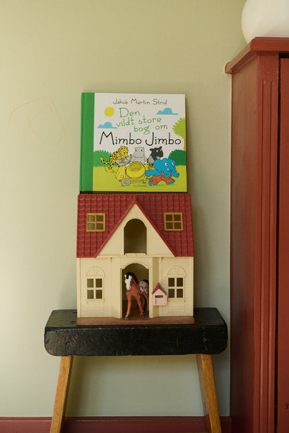 'Den vildt store bog om Mimbo Jimbo' written by Jakob Martin Strid and published by Gyldendal, sits on top of a play house.