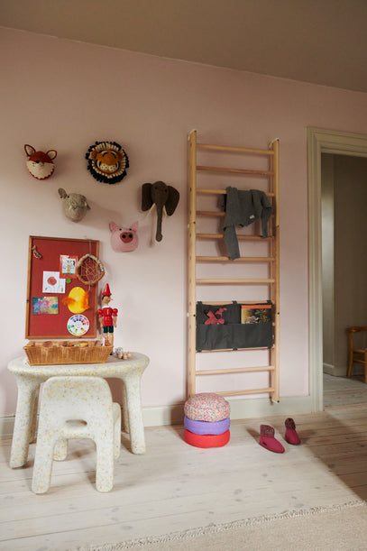 A vanilla-coloured chair-and-table set is placed next to the Endeløs Wall Bar, hanging on the wall by the door. A grey cashmere sweater from Studio Mini hangs on the wall bar, while three colourful Stapelsteins and a pair of indoor shoes in pink are placed on the floor.