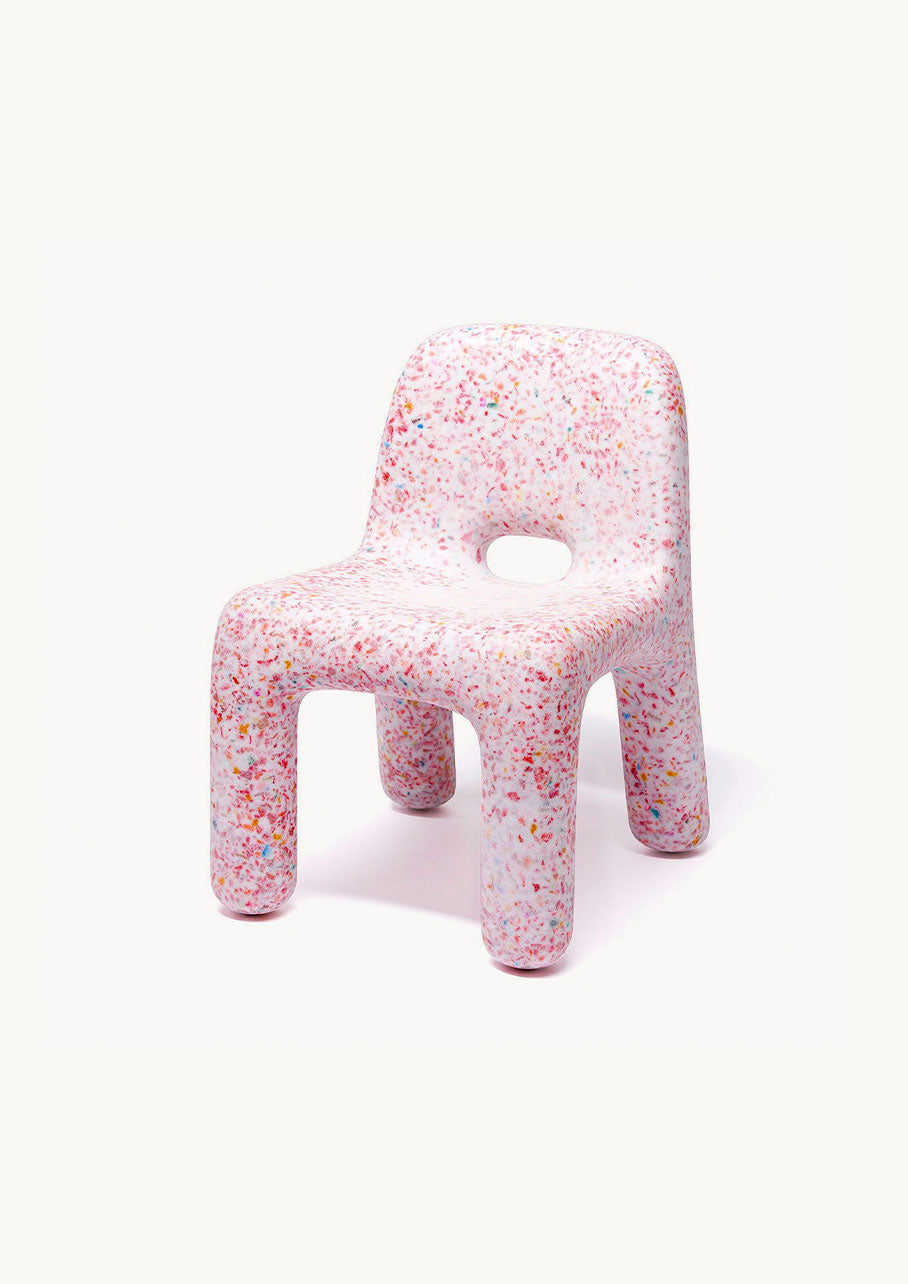 This is the Charlie Chair – a chubby, playful little chair. It might look heavy, but it only weighs 2,9 kg. making it easy to move around the house, even for children. Its soft forms and rounded edges, and its sturdy body and legs, make this a great chair for toddlers and kids.