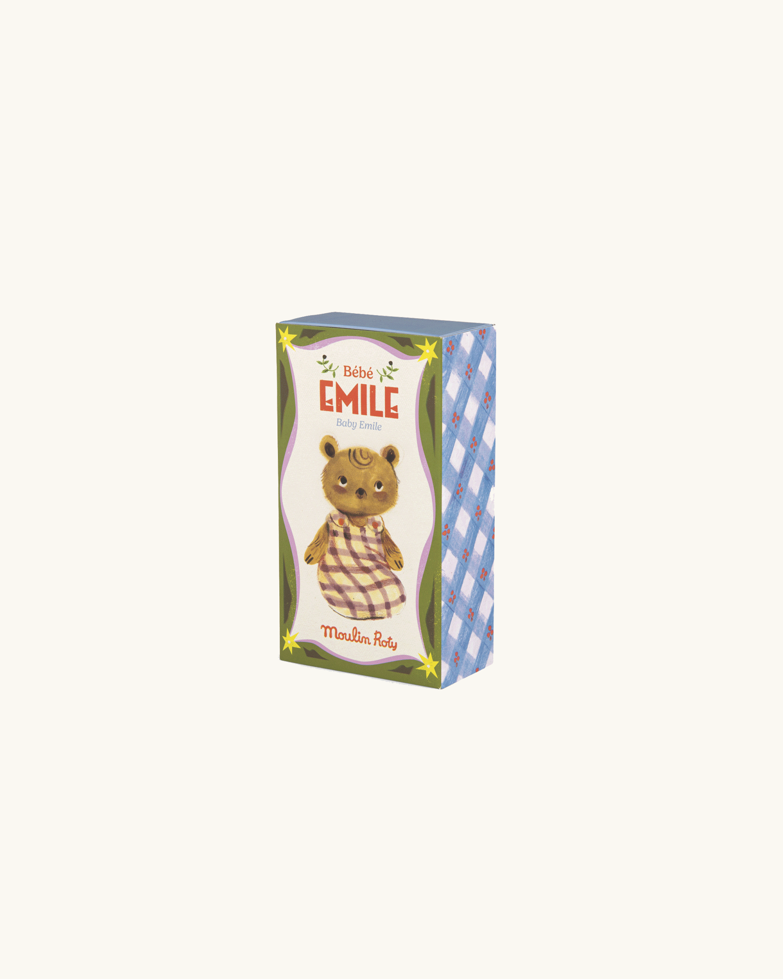 The bear comes in a box designed like a vintage matchbox that can be opened and closed. The bear can be tucked in the small sleeping bag at nighttime or when it's time for a nap.