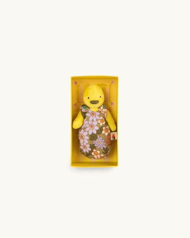 The duck comes in a box designed like a vintage matchbox that can be opened and closed. The duck can be tucked in its small sleeping bag at nighttime or when it's time for a nap.