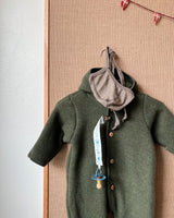 A classic baby suit that comes with a hoodie, rounded neck, classic fit and long sleeves. It comes with wooden buttons that go down the front.