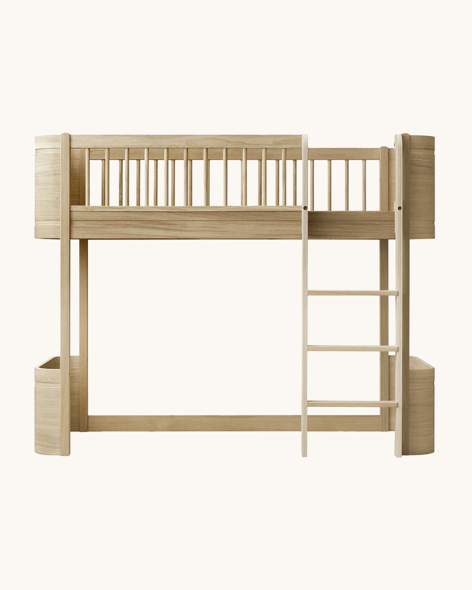 The 'Wood Mini' bunk bed is made of white-oiled solid oak and moulded birch veneered in oak. Leather straps at the headboards. Non-visible screws.