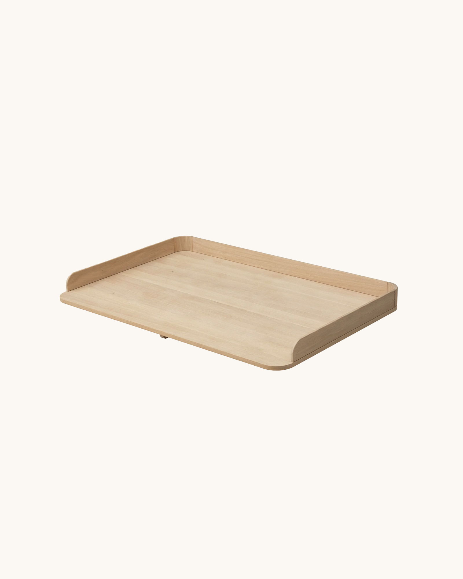 The Wood nursery top in oak is designed as a supplement to the Wood dresser in oak with 3 drawers, effortlessly transforming it into a functional nursery dresser. The spacious nursery top with rounded corners provides ample space for a changing cushion and other baby essentials. It is easily mounted and secured with a small grip at the front, ensuring it stays in place. Once no longer needed, it can be easily removed without leaving any marks, allowing the dresser to be used for its original purpose for many years to come.