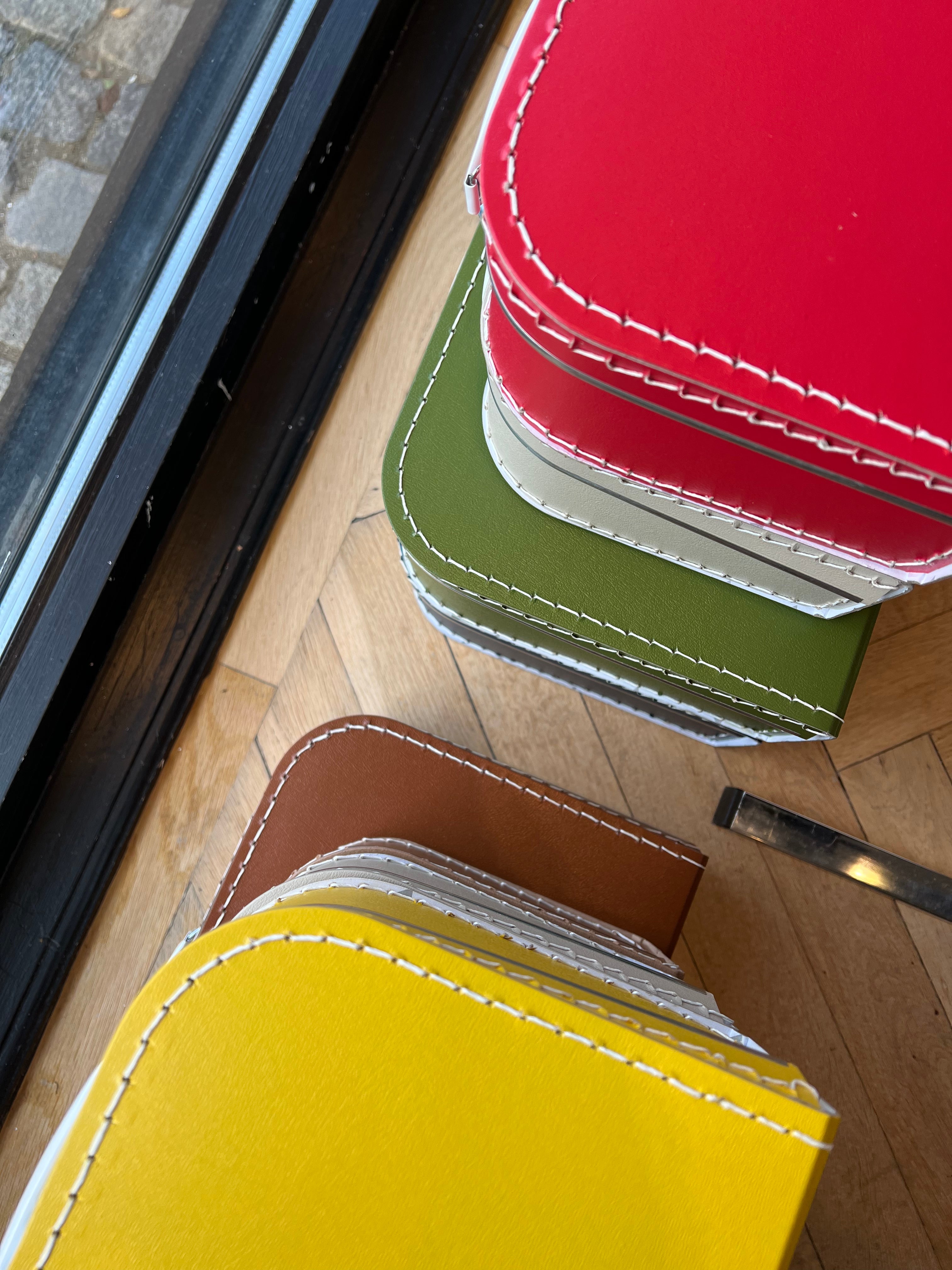 This cardboard suitcase come with cream coloured thread overstitching, and with a metal lining protecting the edges.