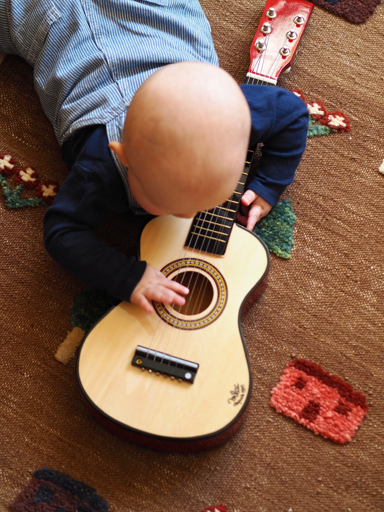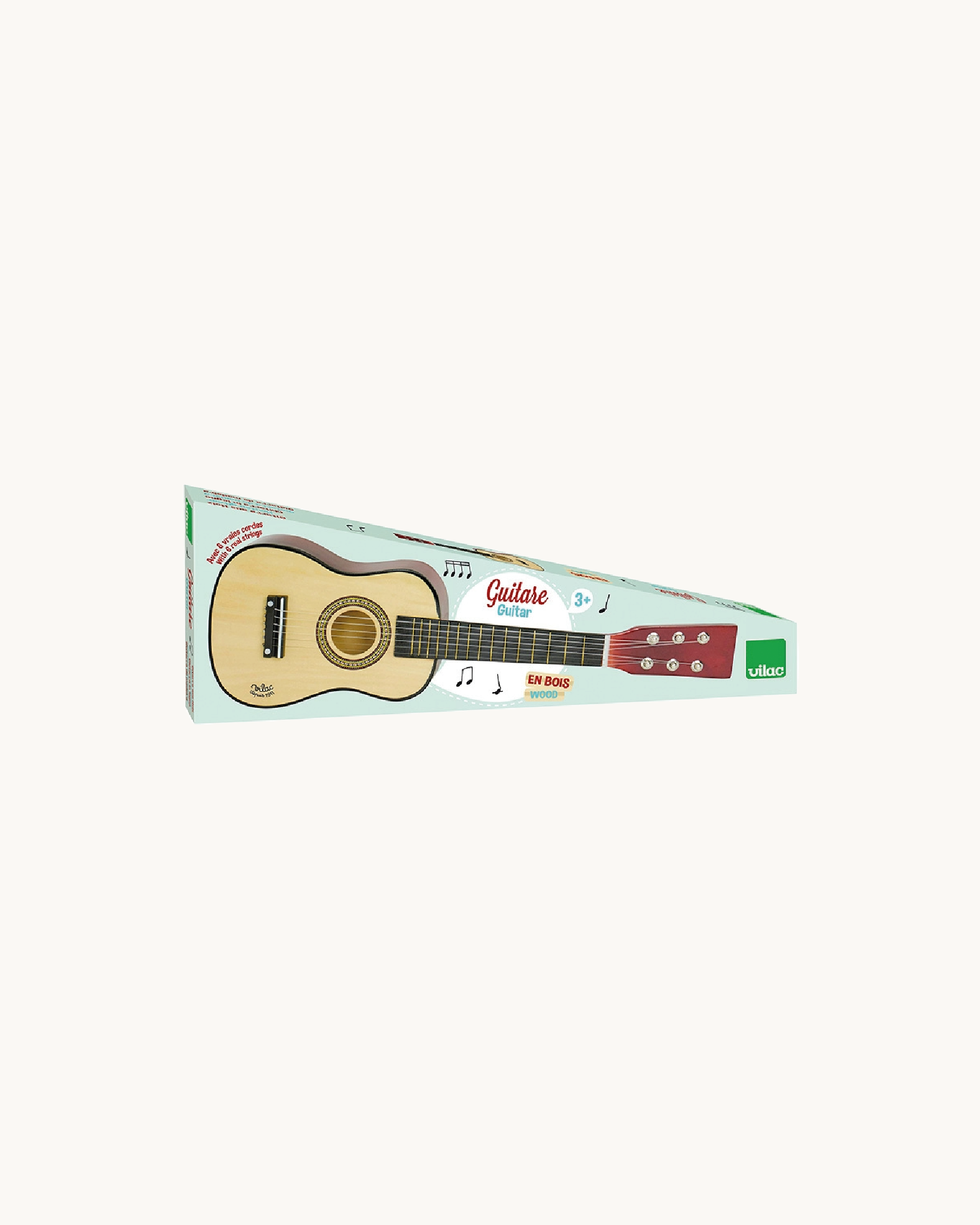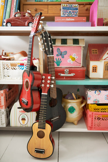 This fun toy is a mini version of a classic guitar, designed to spark joy in youngsters' hearts. Supplied with steel cords and a plectrum.